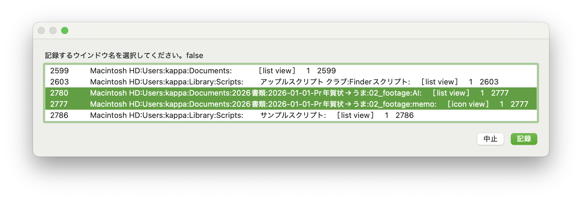 ダウンロード(7KB)Finder選択範囲の一時記録.scpt(2016-11-28-folder-rec-selection.zip)