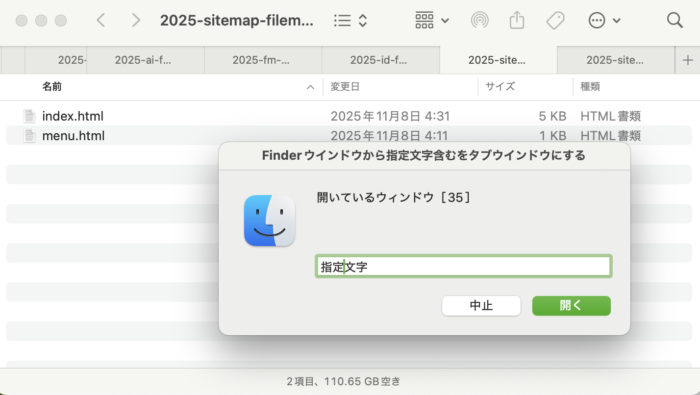 ダウンロード(51KB)Finderウインドウから指定文字含むをタブウインドウにする.scpt(2025-11-25-Finder-every-to-tab-window-a.zip)